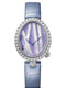 Case in 18-carat white gold, cambered ovoid with a delicately fluted caseband. Bezel and lug set with 64 brilliant-cut diamonds (approx. 1.654 cts). Crown set with a briolette diamond (approx. 0.15 ct). Sapphire-crystal caseback. Dimensions 32.7 x 27.3mm. Water-resistant to 3 bar (30m). Dial in lavender-coloured mother-of-pearl, individually numbered and signed Breguet. Offset hours chapter at 6 o'clock with Roman numerals in white natural mother-of-pearl marquetry. Breguet open-tipped hands in blued steel. Self-winding movement, numbered and signed Breguet. Cal. 586/1. 63/4 lignes, 29 jewels. 38 hours power reserve. In-line Swiss lever escapement. Breguet balance on a silicon spring. Balance frequency 3Hz. Adjusted in 6 positions. Leather strap. Also available with a white gold bracelet set with diamonds: Reference 9818BB/5V/J51 DDD0