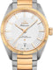 Along with a new standard of quality, the simple yet captivating design makes this watch a true object of desire. For this model, the stainless steel case is brought to life by a vibrant 18K yellow gold fluted bezel, and the opaline silvery Pie Pan" dial is a classic feature inspired by the first 1952 Constellation model.
